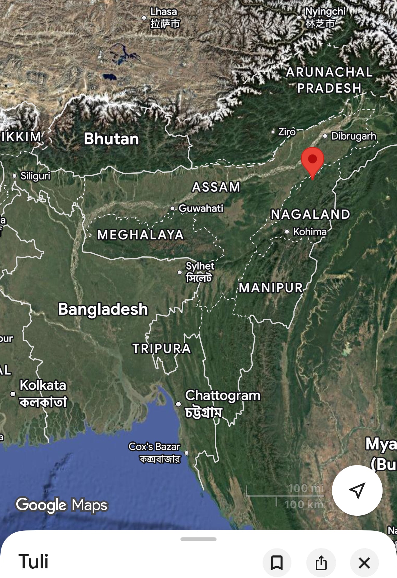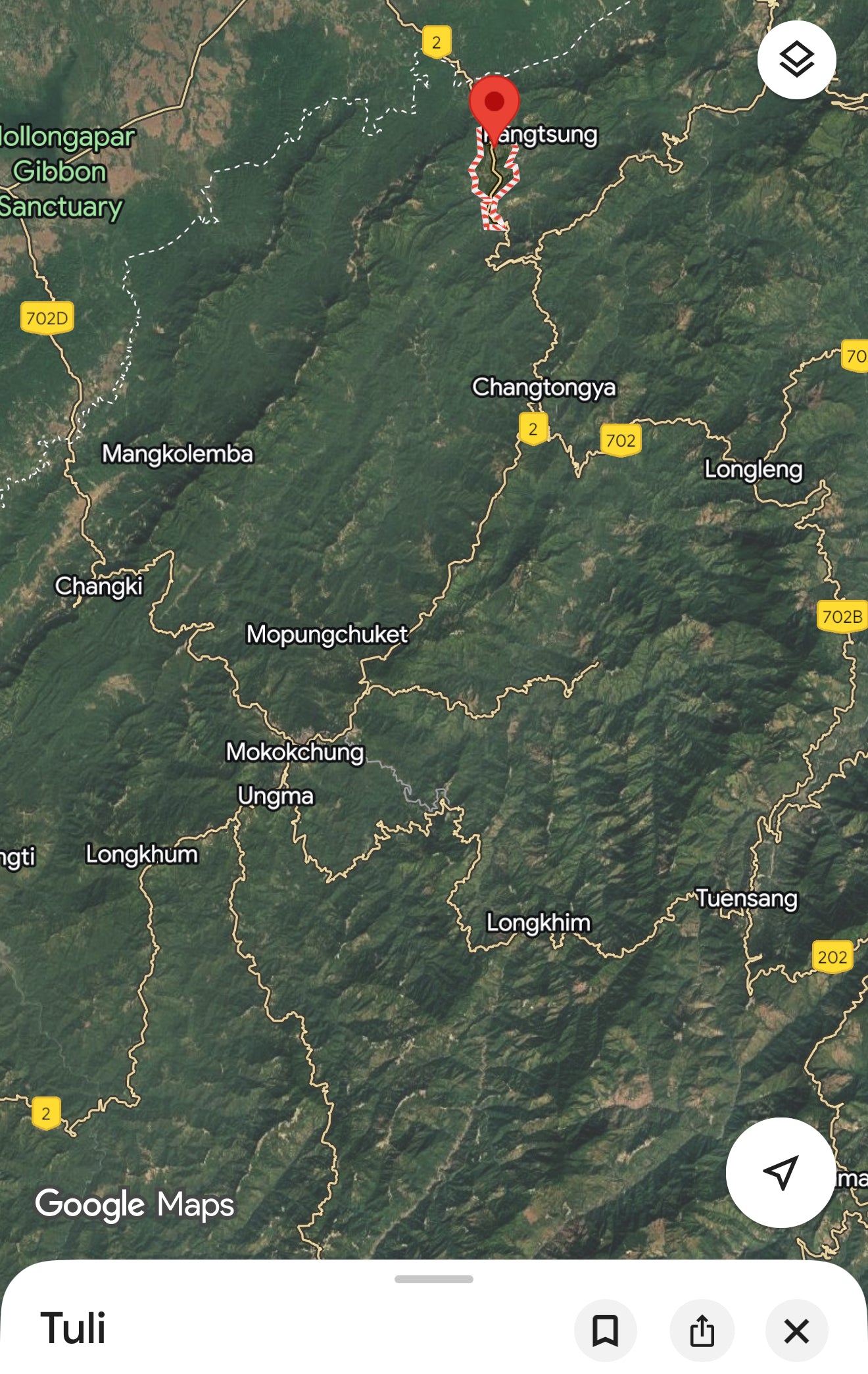 Tuli is a small town in the Mokokchung district of Nagaland in northeast India, situated on the right bank of the Milak River about 80 km north of the district headquarters, Mokokchung. It sits where the Langpangkong Range rises from the surrounding plains, so the immediate landscape is a mix of low rolling hills, river flats, and nearby forested highlands. It's a peaceful small town in the mountains of an area not heavily populated.